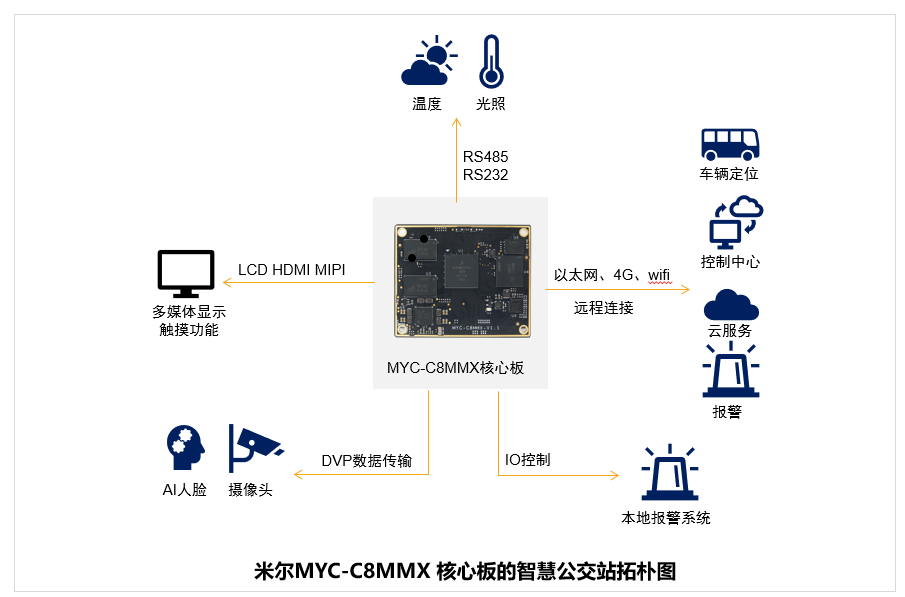 九游老哥J9俱乐部官网MYC-C8MMX核心板可利用4G、千兆网以及WIFI网络,可提供长距离大数据的传输功能,远程连接车辆定位、控制中心和云服务系统;其中,LoRa,蓝牙,RS485, RFID实现短距离设备的接入,配套有HMI与互联网系统能让开发者得心应手,可拓展实现多媒体广告信息发布、公交站台视频监控等功能,连接公交卡充值查询系统、公共自行车系统、110公安报警联动系统等,便于客户灵活定制。