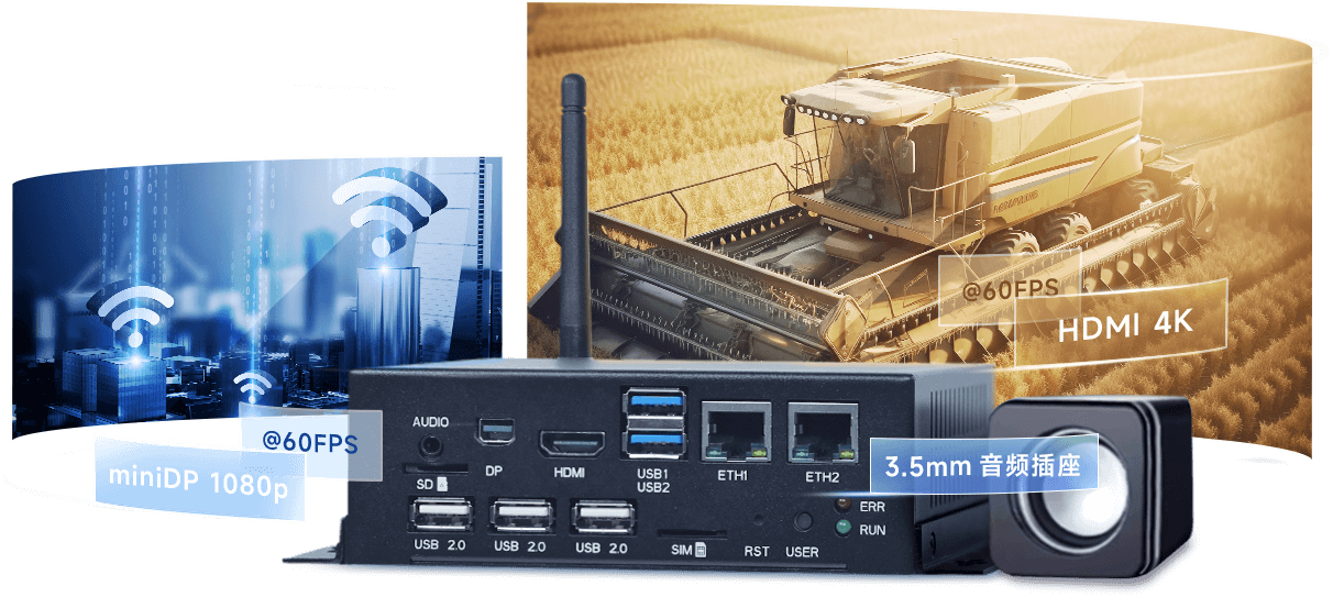 MYD-LT527-GK-B微型工控机具备HDMI+miniDP显示接口,支持4K+1080p,3.5mm音频插座。