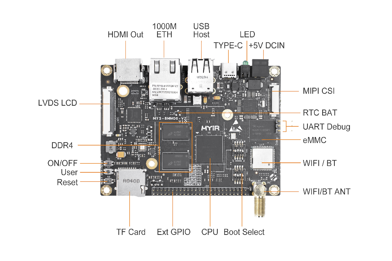 MYS-8MMX-V2单板,采用高密度高速电路板设计,基于i.MX8MMini处理器,在大小为 69x95mm 的板卡上集成了以太网、TYPEC USB、USB Host、TF Card、WIFI/BT、M.2接口、用户按键、LED、LVDS LCD 接口、MIPI CSI接口、HDMI输出、IO 扩展接口等功能。