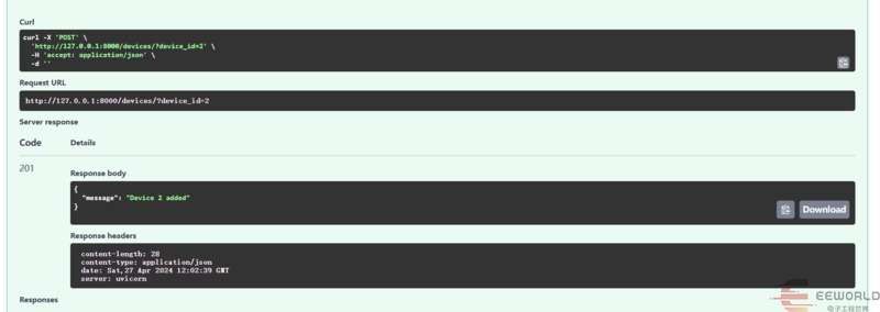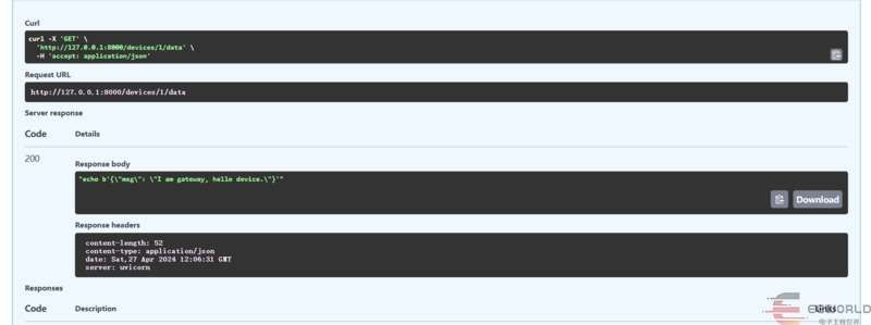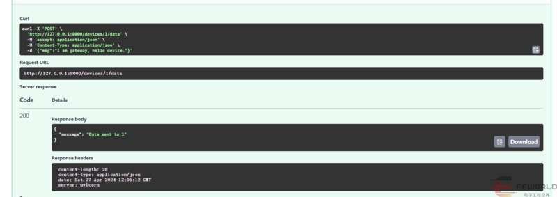 GET /devices/{device_id}/data:获取指定设备的最新数据。 POST /devices/{device_id}/data:发送数据到指定设备。