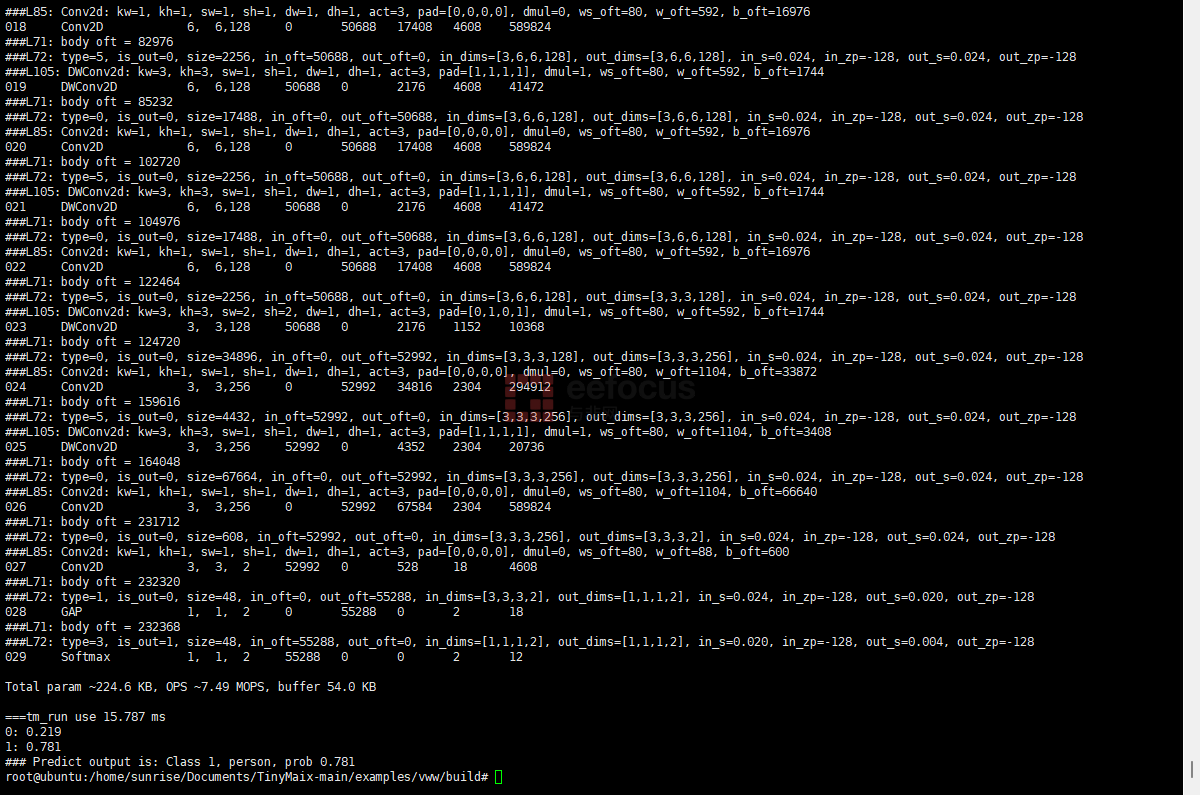 MBNET 示例运行输入了一张 96×96×3 的 RGB 图像,输出 1000 分类,共消耗了 16.615 毫秒
