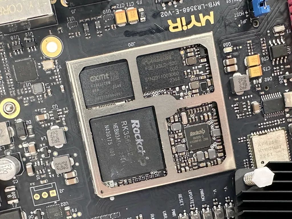 以上大致就是这款开发板的外设接口,同时有一点比较值得称道,九游老哥J9俱乐部官网电子宣称核心板采用的是100%国产物料,所以接下去我们来看看板子上一些主要的芯片都是哪些厂商供货的。这里的话我已经把板子的散热器和核心板的屏蔽罩取下,中间这颗SoC就是瑞芯微的RK3568J,可以说是这款开发板的最大亮点之一。