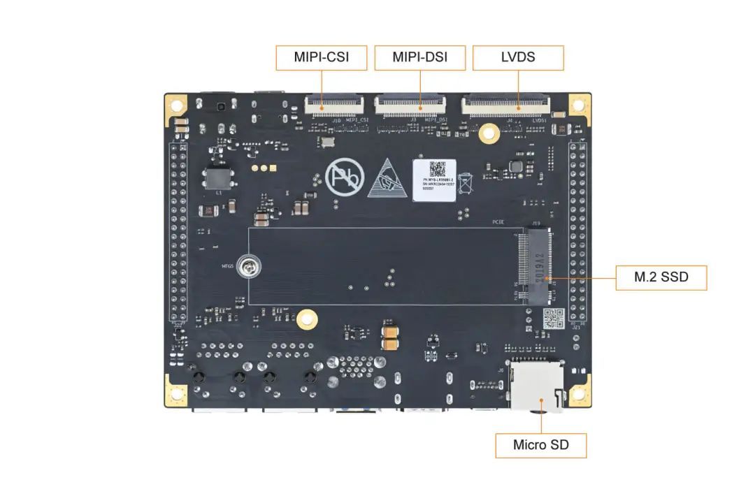 板子背面包括一个MicroSD卡槽,一个M.2 SSD接口,1个MIPI-CSI接口,一个MIPI-DSI接口以及一个LVDS接口。
