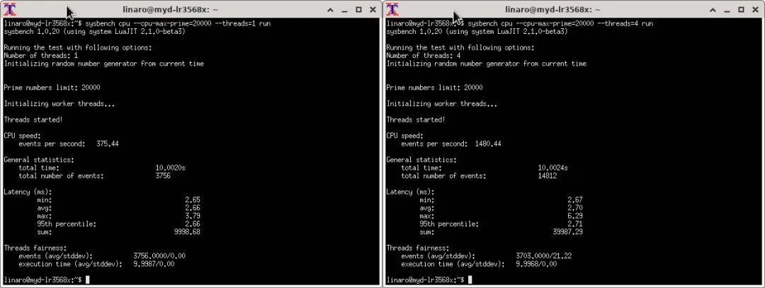 通过通用的性能测试工具Sysbench实际测试了下CPU的性能,以下分别是单核和4核的测试结果。