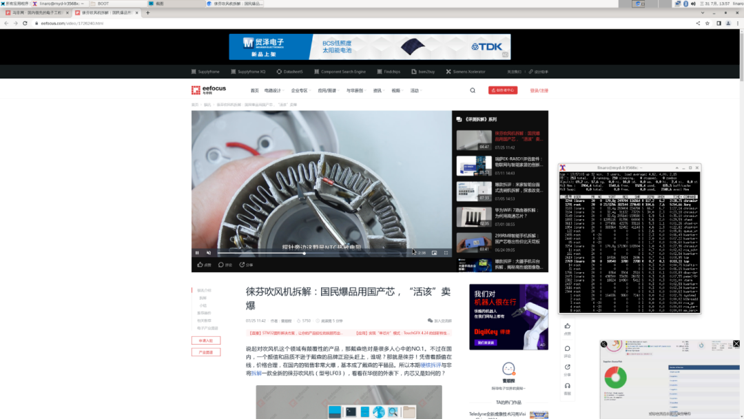 那接下来就上电看下。我拿到的这个板子上电后发现默认烧录的是Debian Linux系统,64位操作系统,带有 Xfce 桌面环境,4GB的内存。从实际的使用情况来看,比如观看网页上的视频,CPU的占用率已经达到100%,然后再进行一些额外的操作,确实会有些卡顿。跟目前市面上主流的旗舰手机SoC相比还是有差距的,毕竟价格、定位都不一样。