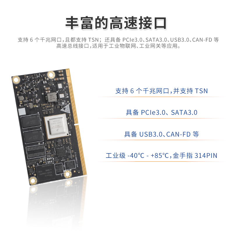 MYC-J1028X核心板及开发板具有丰富的高速接口,可支持6个千兆网口,且都支持TSN;还具备PCIe3.0、SATA3.0、USB3.0、CAN-FD等高速总线接口,适用于工业物联网、工业网关等应用。