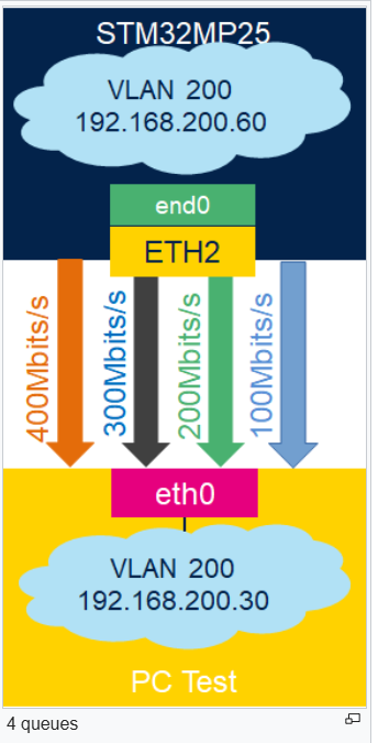 //Stream with SKB priority 6 : TOS=0x14 == SO_PRIORITY=6 // https:man7.org/linux/man-pages/man8/tc-prio.8.html root@myd-ld25x:~# iperf3 -c 192.168.200.30 -u -b 0 -p 5003 -l1472 -t60 --tos 0x14 & //Stream with SKB priority 4 root@myd-ld25x:~# iperf3 -c 192.168.200.30 -u -b 0 -p 5002 -l1472 -t60 --tos 0x1a & //Stream with SKB priority 2 root@myd-ld25x:~# iperf3 -c 192.168.200.30 -u -b 0 -p 5001 -l1472 -t60 --tos 0xa & //Stream with SKB priority 0 (Best effort) root@myd-ld25x:~# iperf3 -c 192.168.200.30 -u -b 0 -p 5000 -l1472 -t60 &