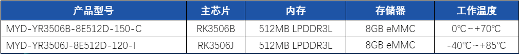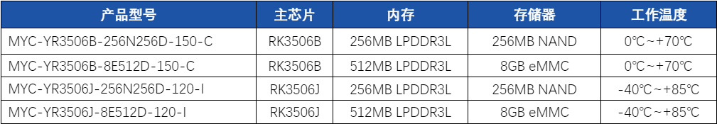 表 MYC-YR3506核心板选型表