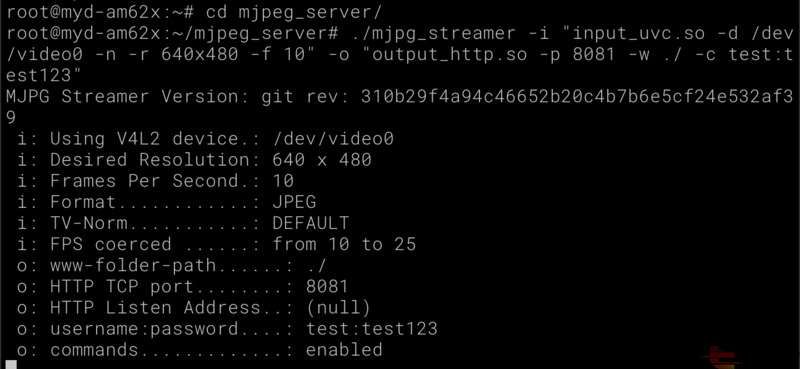 cd ~/mjpg_streamer ./mjpg_streamer -i "input_uvc.so -d /dev/video0 -n -r 640x480 -f 10" -o "output_http.so -p 8081 -w ./ -c test:test123"