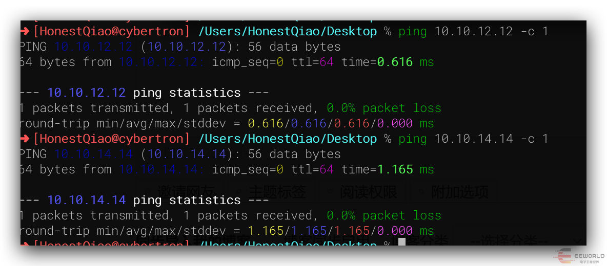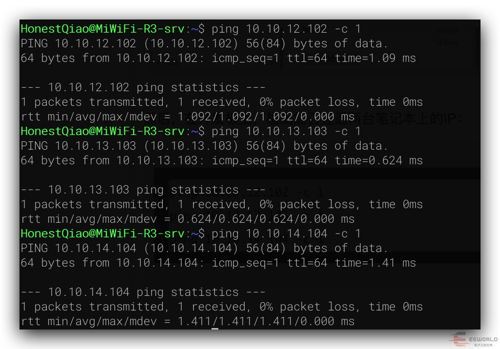 然后,在开发板上,检测能否连通两台笔记本上的IP:
