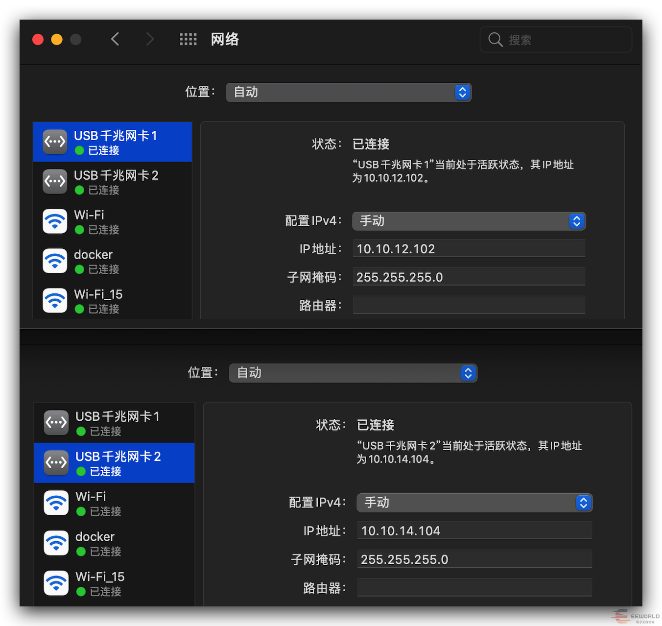 然后,在MacBook Pro上,设置2块USB千兆网卡对应的IP地址: