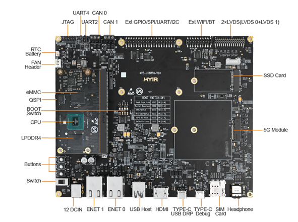 MYC-JX8MPQ核心板拥有2个千兆以太网,具有AVB、IEEE 1588、EEE和1个w/ TSN、2个两用USB 3.0/2.0、带C型PHY、PCIe Gen 3、3个SDIO 3.0、2个CAN FD等接口,保障数据的传输速度和准确性。