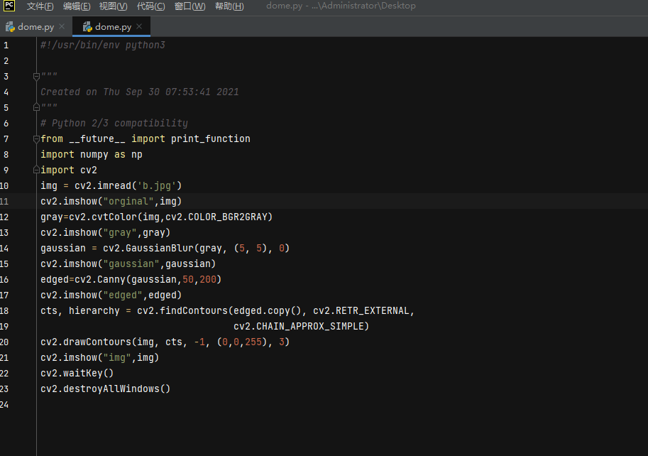 from future import print_function import numpy as np import cv2 img = cv2.imread('b.jpg') cv2.imshow("orginal",img) gray=cv2.cvtColor(img,cv2.COLOR_BGR2GRAY) cv2.imshow("gray",gray) gaussian = cv2.GaussianBlur(gray, (5, 5), 0) cv2.imshow("gaussian",gaussian) edged=cv2.Canny(gaussian,50,200) cv2.imshow("edged",edged) cts, hierarchy = cv2.findContours(edged.copy(), cv2.RETR_EXTERNAL, cv2.CHAIN_APPROX_SIMPLE) cv2.drawContours(img, cts, -1, (0,0,255), 3) cv2.imshow("img",img) cv2.waitKey() cv2.destroyAllWindows()