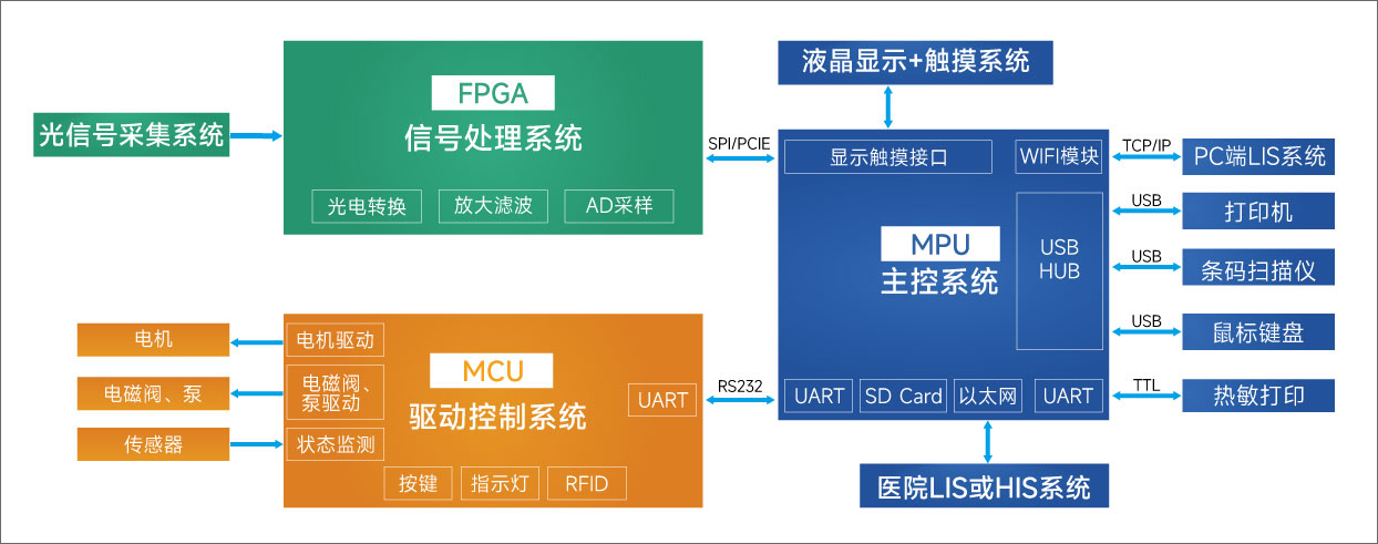 l 主控系统:主控系统作为整个系统的核心,一方面通过UART发送控制指令给到驱动控制系统,驱动控制系统的MCU执行电机、电磁阀、泵等外设的控制操作。另一方面通过SPI/PCIE发送采集指令信号给到信号控制系统FPGA进行数据采集,数据采集处理后通过SPI/PCIE上传到主控系统进行数据处理和分析。分析结果一方面通过触摸显示系统进行结果展示和打印,另一方面通过网络上传医院LIS或HIS系统。