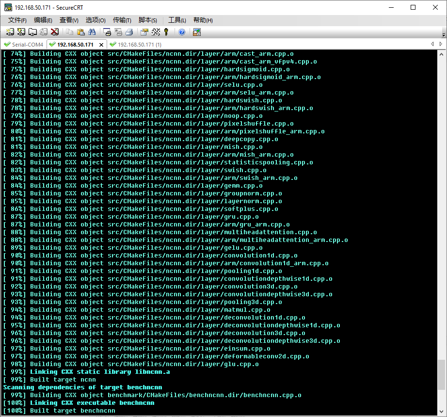 添加完该开发板的编译工具链后,就可以使用cmake来生成编译所需的makefile文件了。在cmake时,可以指定除了编译ncnn库外,还可以编译ncnn例子程序。命令如下: