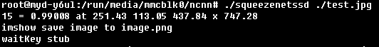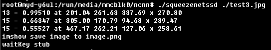 测试图片内容识别,先用上面的图,再使用 squeezenetssd 来执行。执行前先下载 squeezenet_ssd_voc.bin和 squeezenet_ssd_voc.param 到板上ncnn当前目录下,然后执行: