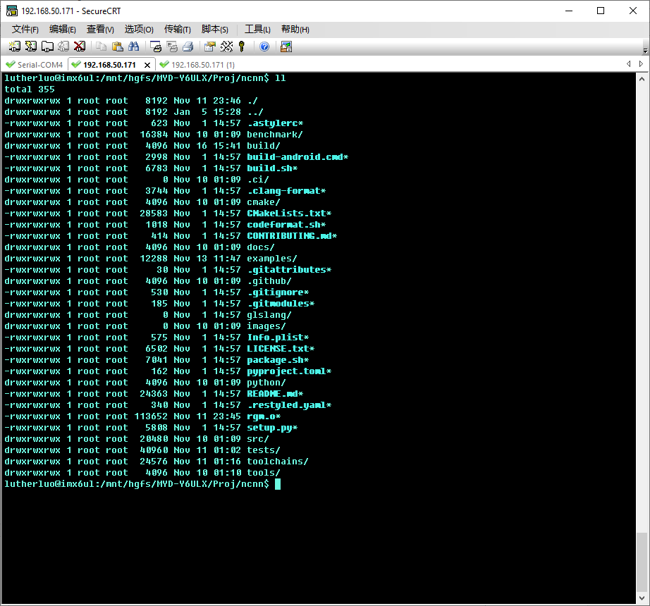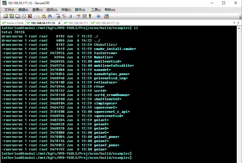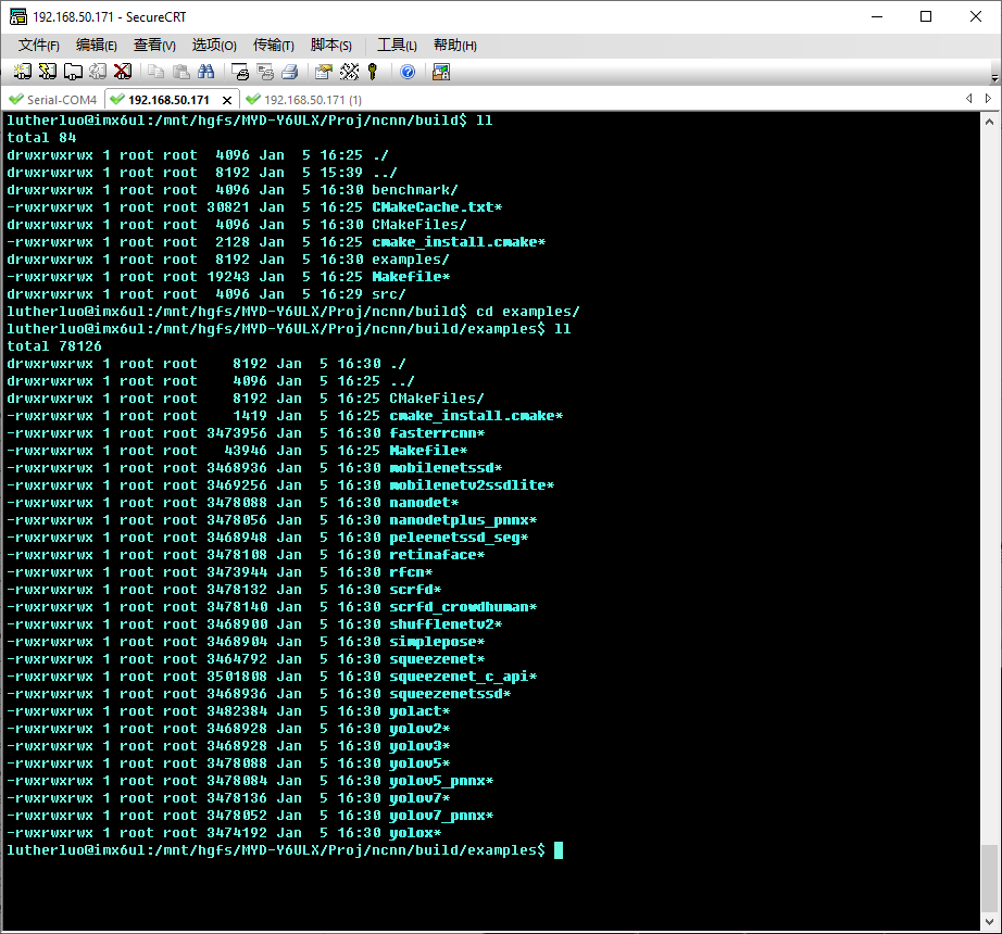 这里在MYD-Y6ULX-V2开发板上测试ncnn的应用例子,这里就用ncnn下的例程来做测试,在上面编译完example后,在build目录下会产生example的目标板的可执行文件。编译出来的例子程序如下,把他们全部传到开发板上。