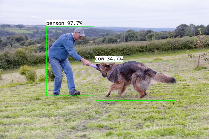 上面的识别,因为输出的第二个目标被第三个目标遮盖,第二个识别为“Dog”,所以识别准确度还是比较高的。
