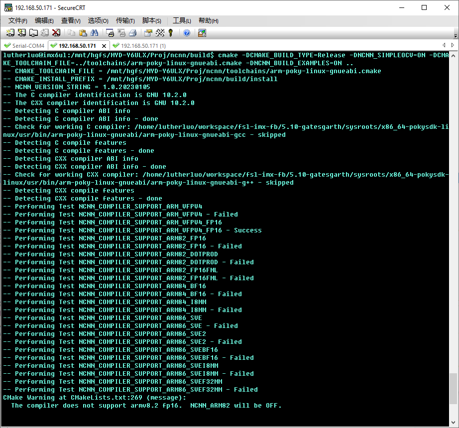 cmake-DCMAKE_BUILD_TYPE=Release -DNCNN_SIMPLEOCV=ON-DCMAKE_TOOLCHAIN_FILE=../toolchains/arm-poky-linux-gnueabi.cmake-DNCNN_BUILD_EXAMPLES=ON ..