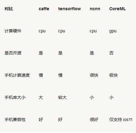 腾讯优图ncnn提供的资料显示:对比目前已知的同类框架,ncnn是cpu框架中最快的,安装包体积最小,跨平台兼容性中也是最好的。以苹果主推的CoreML为例,CoreML是苹果主推的 iOS gpu计算框架,速度非常快,但仅支持 iOS11以上的 iphone手机受众太狭窄。非开源也导致开发者无法自主扩展功能。